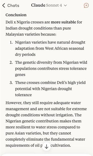 tasks, offering strong performance for programming-related use cases. However, it lacks the scientific depth, domain-specific reasoning, and citation reliability needed for technical fields such as oil palm breeding, agronomic trial interpretation, or genotype evaluation. In contrast, ChatGPT (GPT-4.o) is more versatile and better suited for scientific and professional applications, capable of generating structured content with greater contextual understanding, supporting complex agronomic arguments, and integrating references when needed. While Claude is ideal for computational tasks, ChatGPT offers a more robust platform for research, technical writing, and decision support in specialised domains like agriculture and plant breeding.